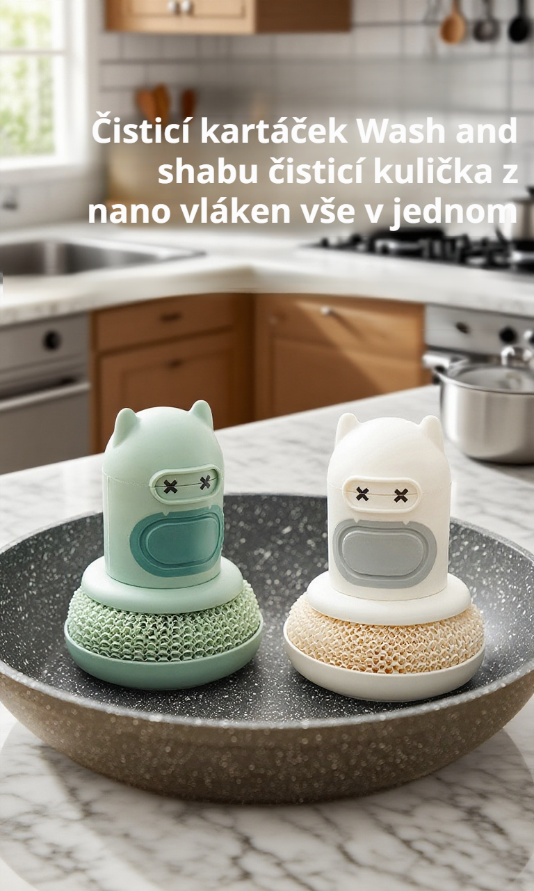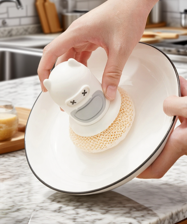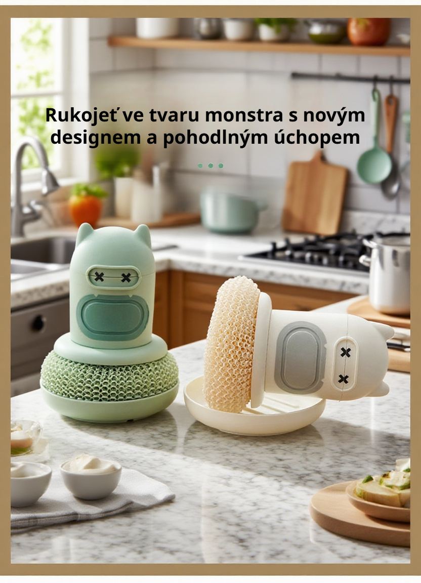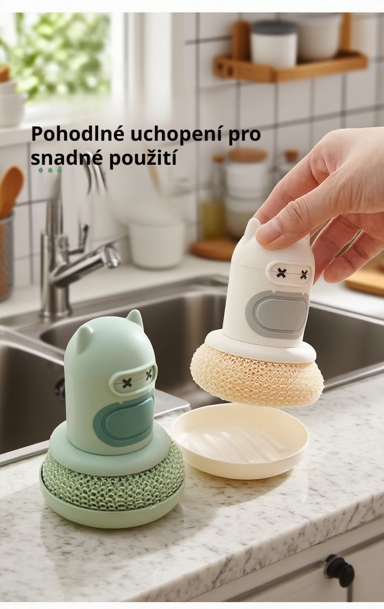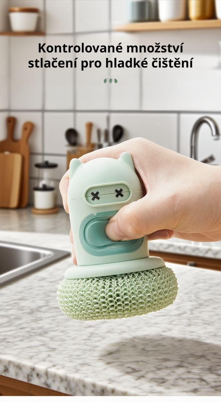 Roztomilý kreslený automatický dávkovač mýdla s kartáčem na hrnce šetří čas, zajišťuje hygienu a usnadňuje mytí nádobí v kuchyni. Jednoduché použití a snadná údržba.
