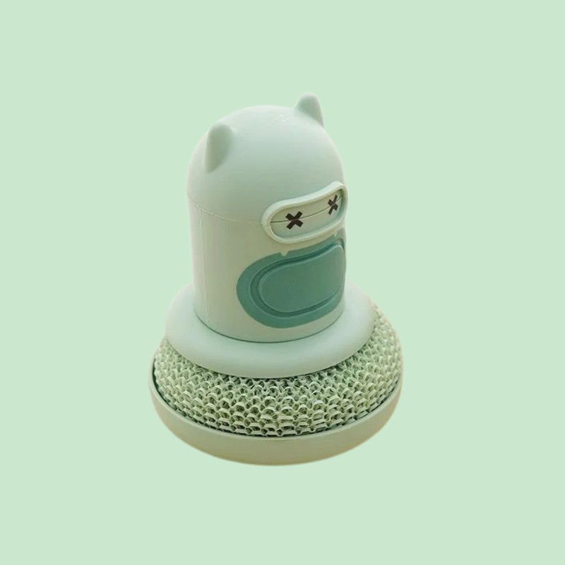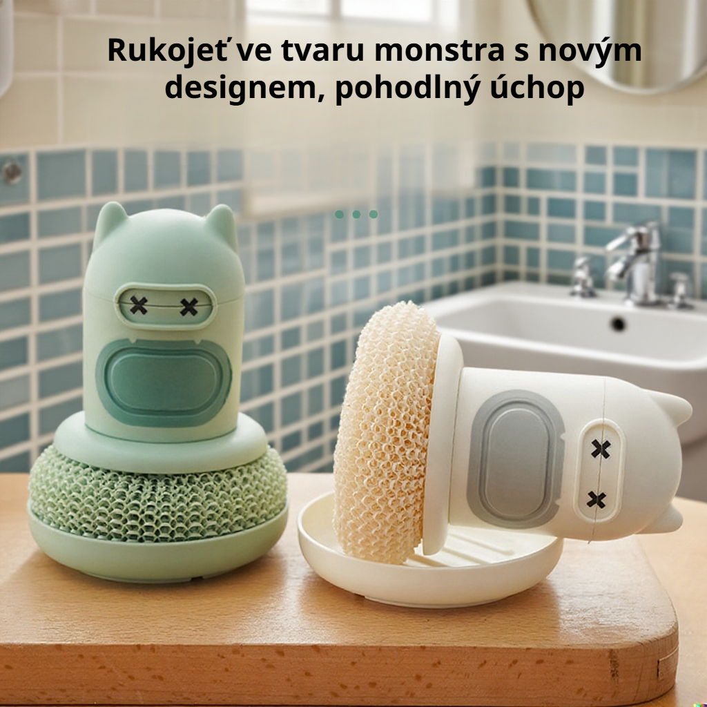 Roztomilý kreslený automatický dávkovač mýdla s kartáčem na hrnce do kuchyně